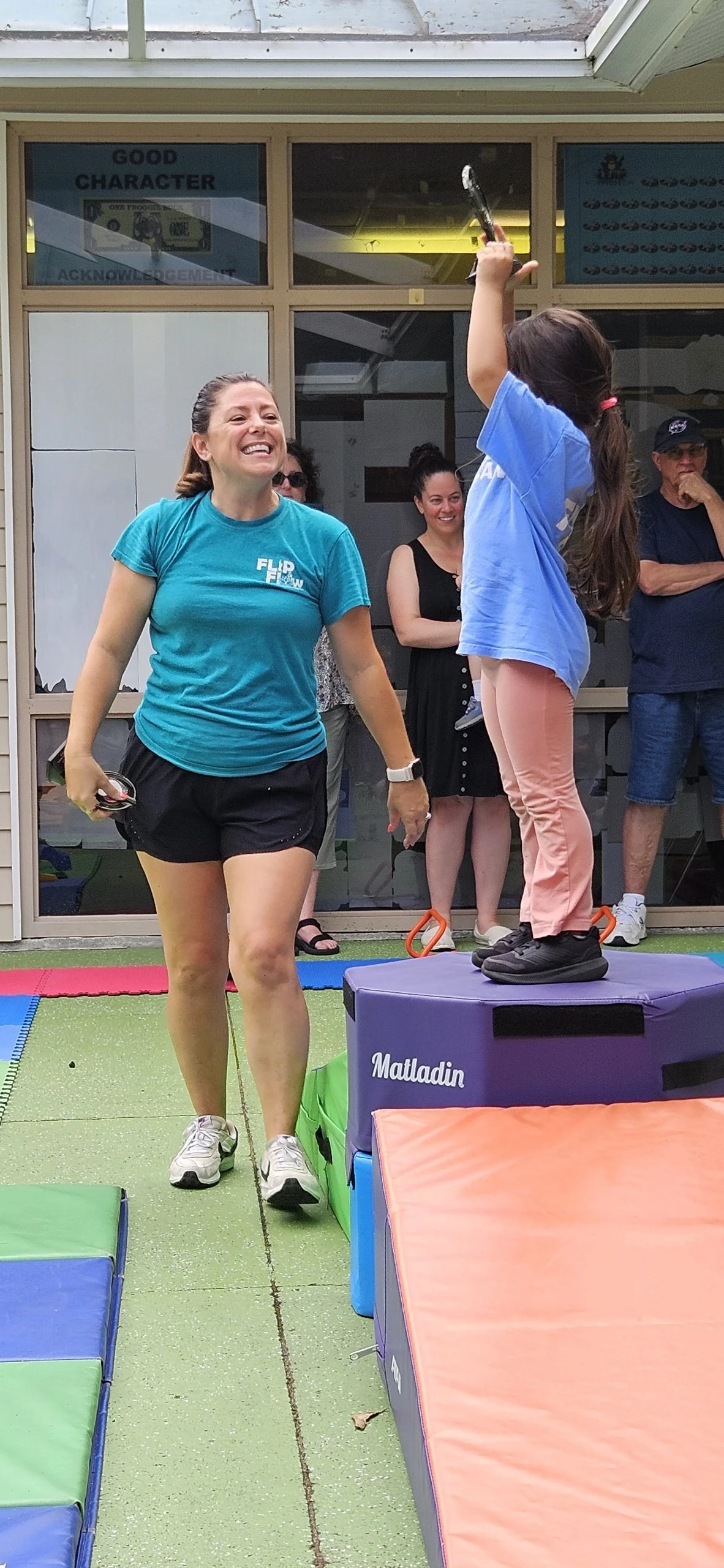 A young girl standing on a padded platform holding a trophy, smiling, while a woman in athletic clothing looks up at her, smiling. Several people in the background watch the scene.