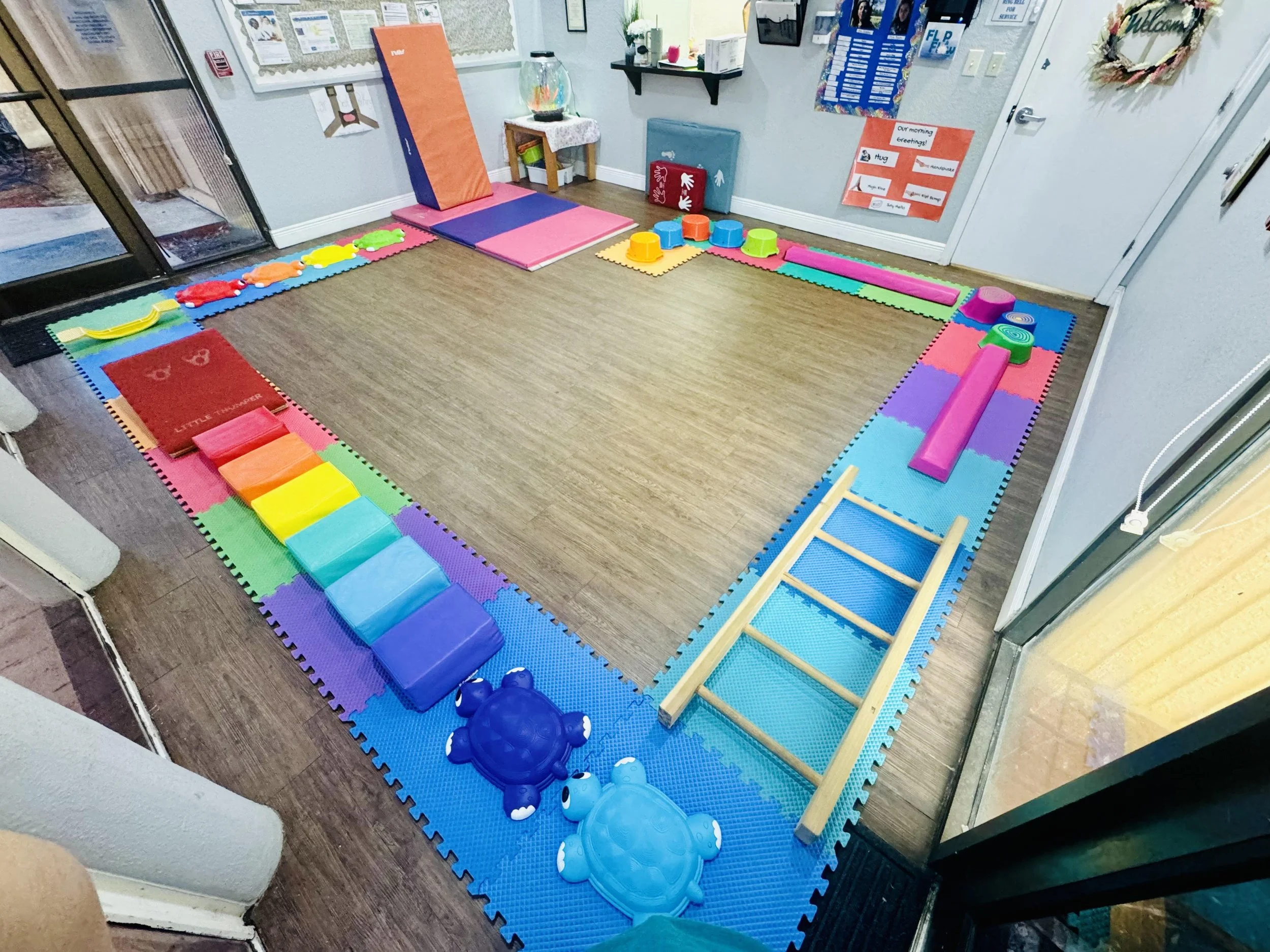 A colorful indoor play area with foam mats and various toys, including a turtle-shaped ride-on, climbing ladder, small slide, and foam blocks, set up in a square formation for children's activities.