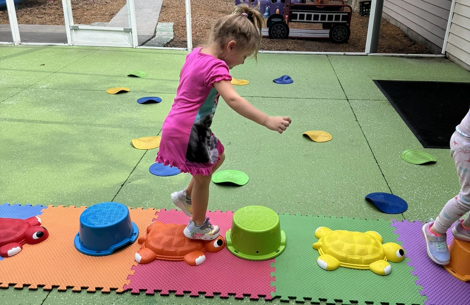 A young girl in a pink and black dress balances on a turtle-shaped stepping stone in an outdoor play area, surrounded by various colorful plastic animal-shaped stepping stones and mats.